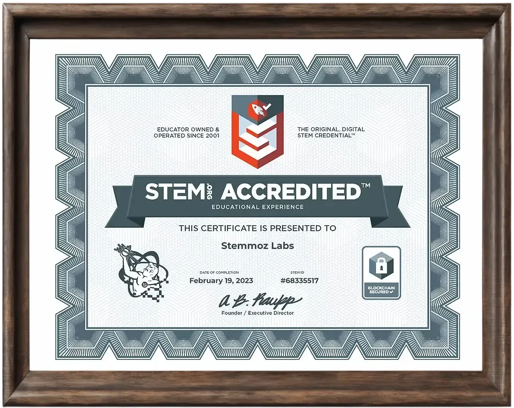 No final de cada curso, cada estudante recebe um certificado da Stemmoz Labs, acreditado pela STEM.org
